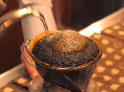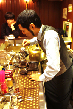 店長の野田敦司(39)さんは、ルパン3世のようなモミアゲの持ち主。席に座りしばらくすると、その力強い髪型と優しげな眼差しとのギャップに気がつく。12年前、毎月15日に開かれる知恩寺の手作り市でコーヒーの屋台を始め、8年前に御多福を開いた。和歌山県出身の野田さんは、小さな頃から、お父さんに連れられて喫茶店に通い、ミキサー