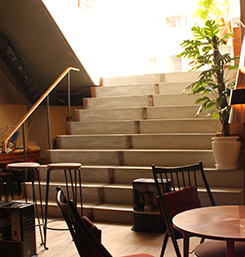 板や一部の天井が低くなっている。内装は、約3ヶ月かけて高田さんが手掛けた。なかでも苦労したのは床貼りで、慣れない頃は一日に床板を3本しか貼れなかったと、苦笑い。そんな苦労を重ねて出来上がったカフェ・モンタージュの音響について、塩見亮(ピアノ)さんは「お客さんが入ると防音効果となり、調度いい響きになります」と話した。