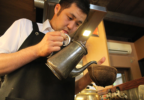 ポタポタとお湯を落としてはとめる。店主の王田洋晶さん(32)は、腰をかがめて、豆がたっぷり入ったネルドリップを見つめるが、なかなか滴は落ちてこない。しばらくすると、一粒ずつのように落ち始め、この作業を丹念に繰り返すこと15分。「お待たせやで」と、陶芸家のお父さんが焼いたカップに珈琲を注ぐと、お客さんはほほ笑む。