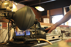 この店でしか味わえない円やかさに気付き始めた。この度数の高いお酒のような味の秘訣は、豆の選定や配合、火の入れ方、抽出方法にあるという。豆は、ブラジル・ガテマラ・パプアニューギニアの三ヵ国から取り寄せて深煎りするが、ブラジルだけは浅煎りも用意。こだわりは、焙煎した豆を新鮮なまま使用せず、わざと約20日置くところ。そして注文が入ると、深煎りのなかに浅煎りを少し加えて細挽きし、鏡で裏側の沁み込み具合も確認しながら、