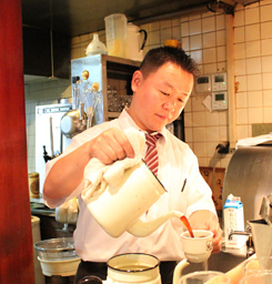 奥の席では、常連客らしい和服姿の女性と背広姿の男性が、珈琲を注文。元木さんは、コーヒーカップを、ボウルに入った熱湯に勢いよくくぐらせ、決まった角度から艶やかな色したコーヒーを注いでいた。