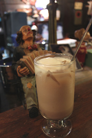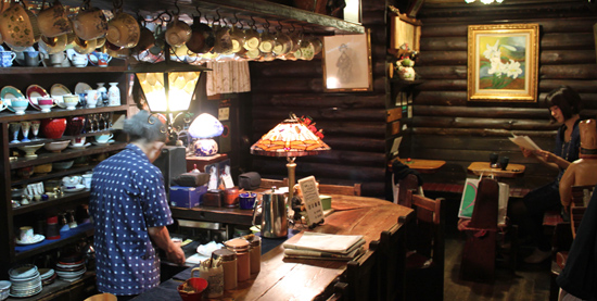 店長の山崎好三さん(56)は、サラリーマンを辞めて、昭和53年にお兄さんとエミール・パコを創業。「店名は、『パンとコーヒー』からつけました。『パコ』の前に何かつけなあかんと思って、『エミール』をつけただけ」と、強面の顔が一変し穏やかに笑う。山歩きが好きで、中部地方の山はほとんど登ったという。壁は丸太で出来ており、入口のドアの上には「エミール・山荘」という木彫りの看板も。10席ほどのカウンター席の上には、コーヒーカップが列をなしてぶらさがり、いまにも「ブランブラン」という音が聞こえてきそう。食器を集めるのも好きという山崎さんは、120ほどあるカップのなかから、その時の気分で選んで、お客さんに出しているという。