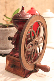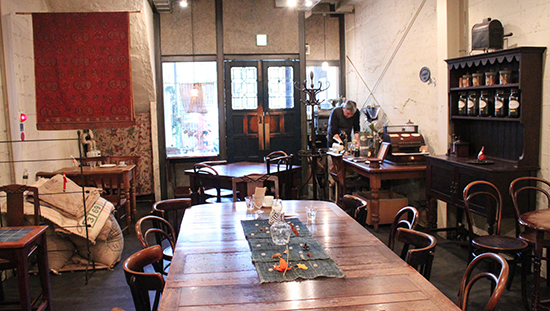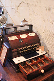 ヨーロッパの廃屋をモチーフにした店内には、120年前のイギリス製のテーブルや椅子が置かれている。ほかにも、色合いからして古そうなミルや焙煎機も、あちらこちらに飾られている。なかでも目にとまるのは、1933年(昭和8)に作られたアメリカ製アンティークレジ。50セント単位となっているボタンを押すと、「ジャーーン!」という大きな音とともに、レジ箱が飛び出す仕組み。珈琲店なのにレジの取材を受けて、つい村上さんがやきもち焼いてしまうほど評判も良い。